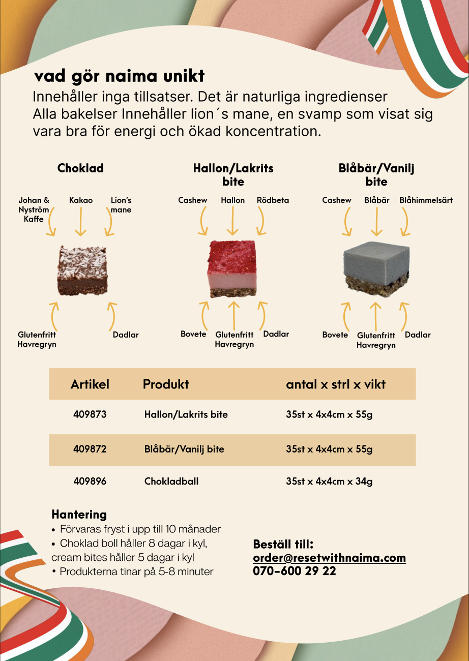 Naima is a modern startup born from a simple but powerful idea: to make healthy treats that not only taste amazing but are also truly good for your body - especially It was founded in 2020 in the kitchen of Sophie Jahn. Naima started as a passion project with a clear mission: to make delicious fika moments accessible to everyone, without compromising on health.your gut.